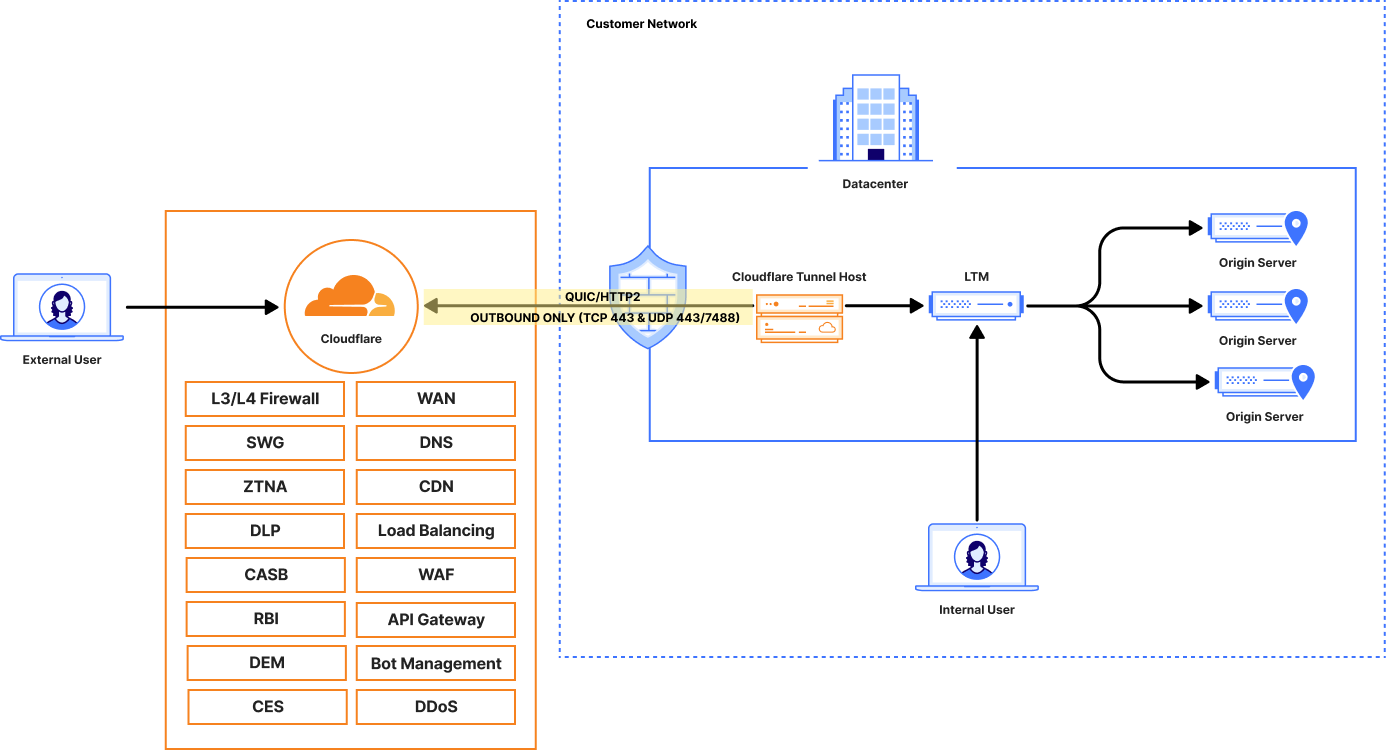 - Cloudflare Tunnel: Creates a secure, encrypted tunnel from the on-premise environment to the Cloudflare network. This eliminates the need for public IP addresses on origins and the risk of opening inbound firewall ports.
