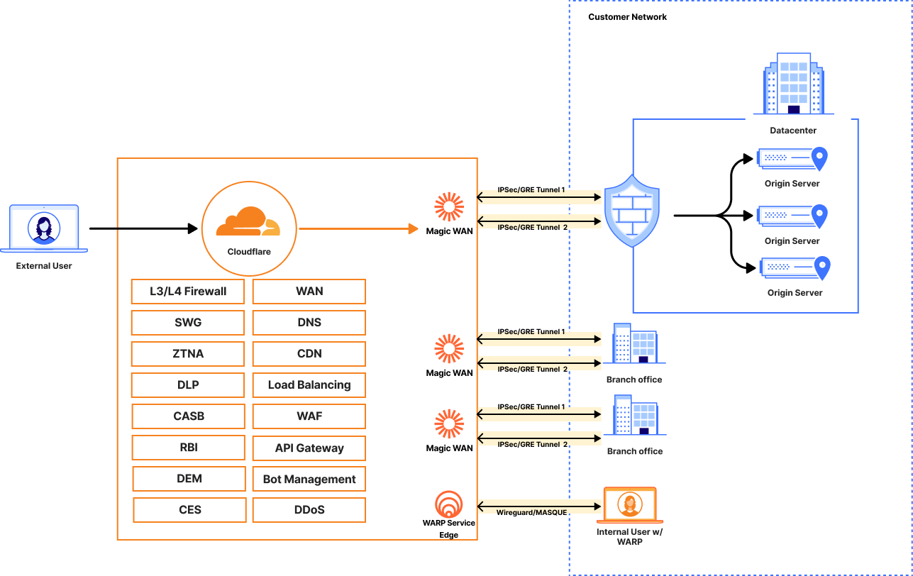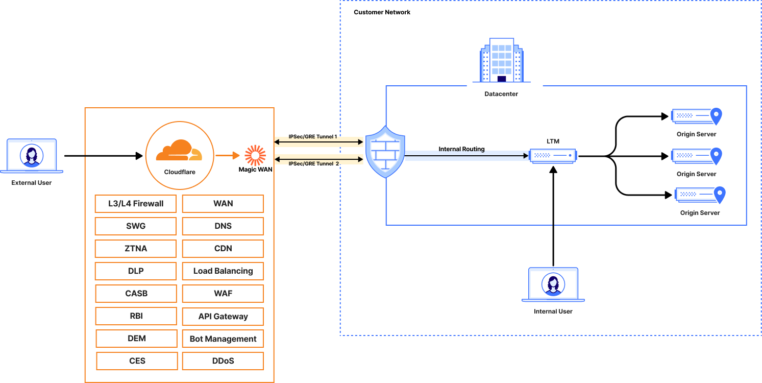 - Internet User → Public DNS → Cloudflare Public LB → Magic WAN → On-Premise Origin